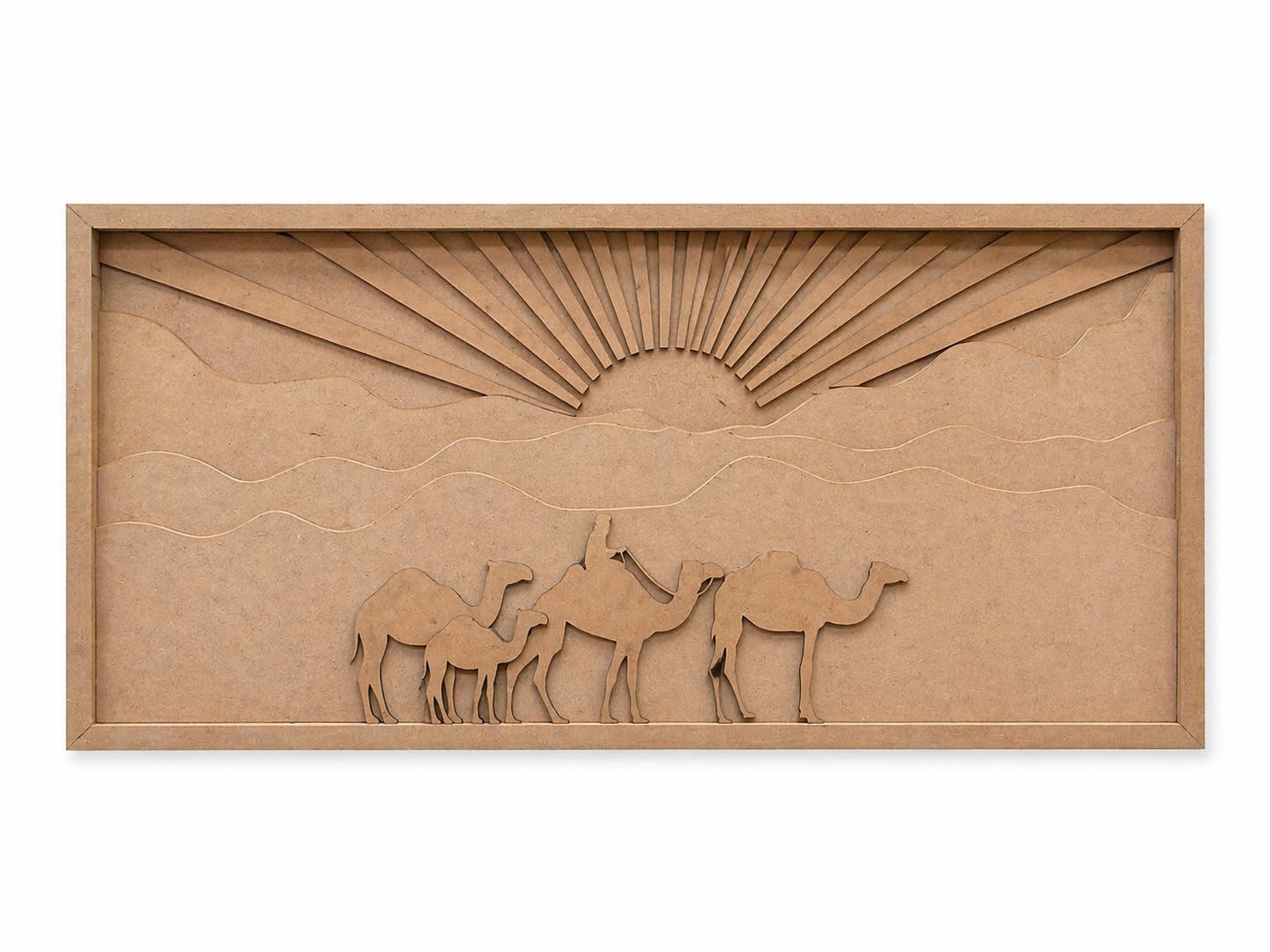 Bring the beauty of the desert into your space with this intricately crafted MDF wall art panel. Featuring a graceful camel caravan walking across layered sand dunes beneath a radiant sunburst design, this piece captures the calm and timeless charm of desert landscapes. Precision-cut detailing creates a stunning 3D layered effect, adding depth and elegance to the design.